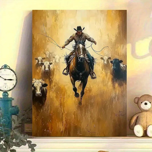 Cowboy Herding Cattle Vibrant Western Scene 40x60cm Metal Print Ready to Hang