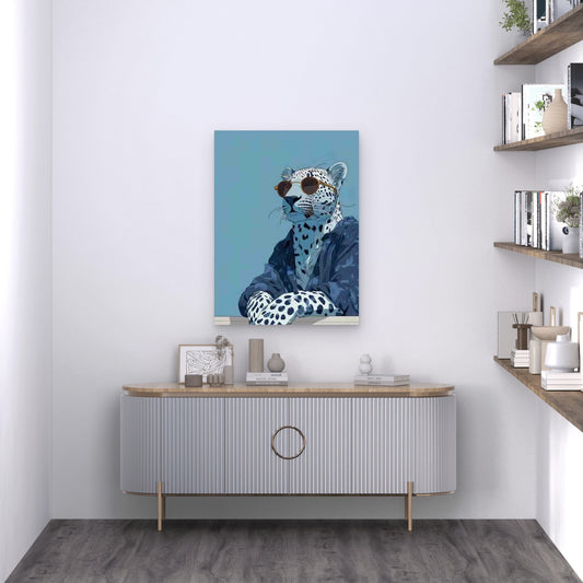 Navy Blue Leopard in Fashion Glasses Metal Print Ready to Hang