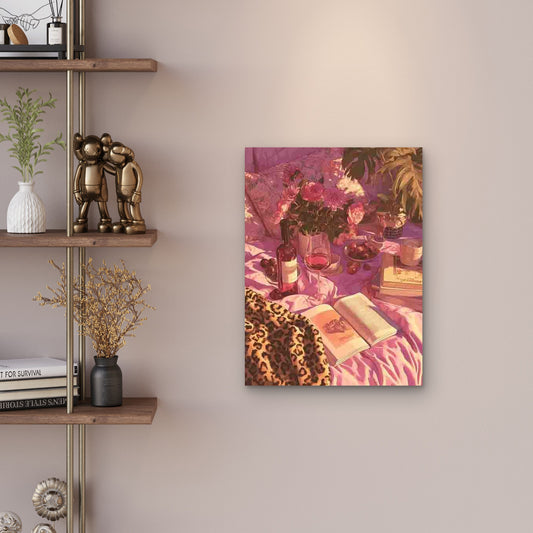 Pink Leopard Bedroom Wine in Bed Metal Print Ready to Hang