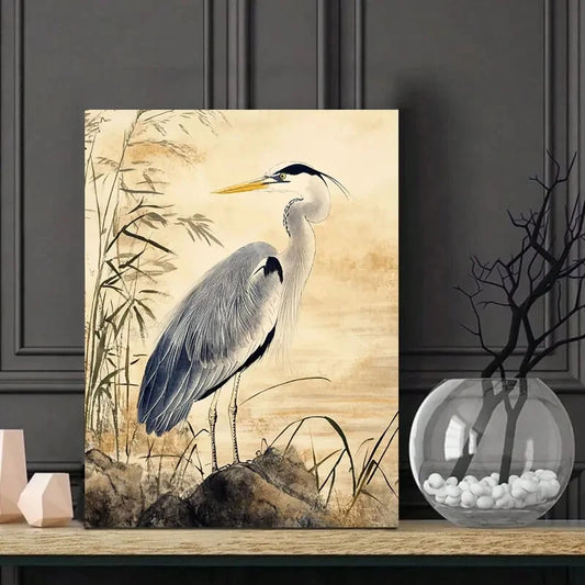 There Is an Elegant Gray Heron Standing on Grassy Rock 40x60cm Metal Print Ready to Hang