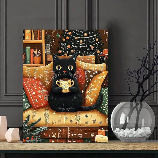 Black Cat Sitting On a Sofa With a Cup Painting 40x60cm Metal Print Ready to Hang