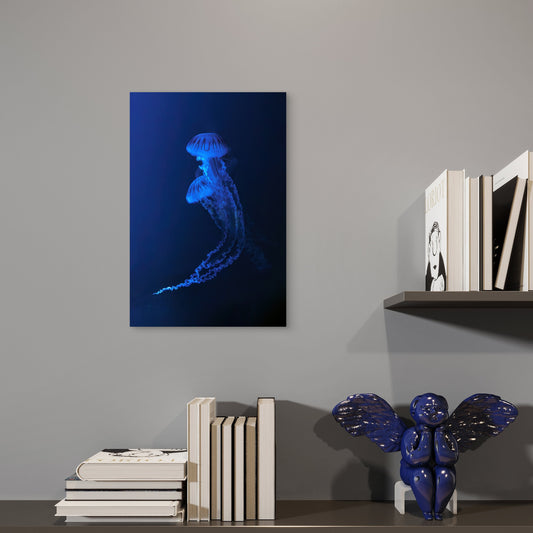 Neon Blue Jellyfish Deep Sea Glow 60x90cm Metal Print Ready to Hang