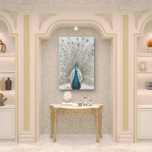 Neutral Blue Teal Peacock Feather Impression 60x90cm Metal Print Ready to Hang