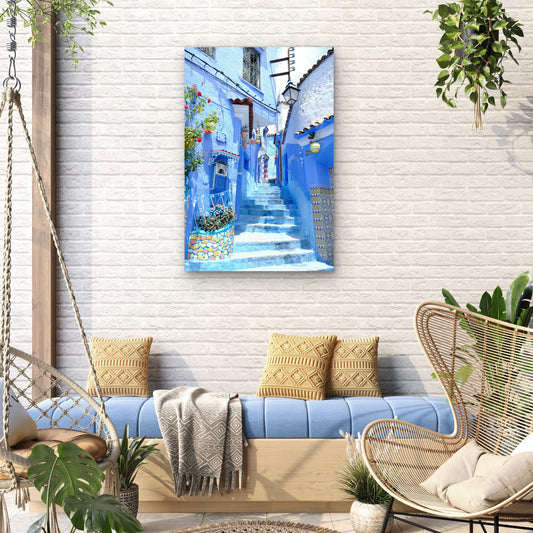 Vibrant Scene in Chefchaouen, Morocco 60x90cm Metal Print Ready to Hang