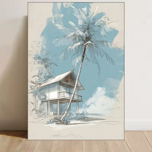 Blue & Teal Ocean Sketch - Palm Tree Cottage 60x90cm Metal Print Ready to Hang