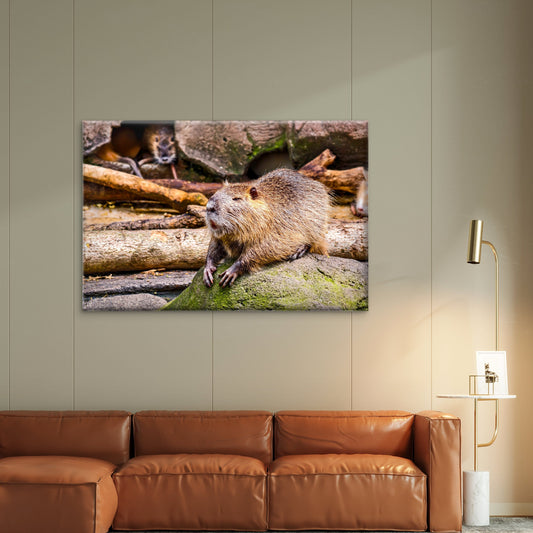 South American Nutria Sits on a Mossy Rock Wall Art Decor 100% Australian Made