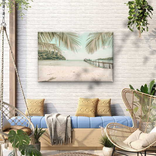 Tropical beach, sea with Coconut Palm Trees in paradise island Neutral Vintage Canvas Print Wall Art Decor 100% Australian Made