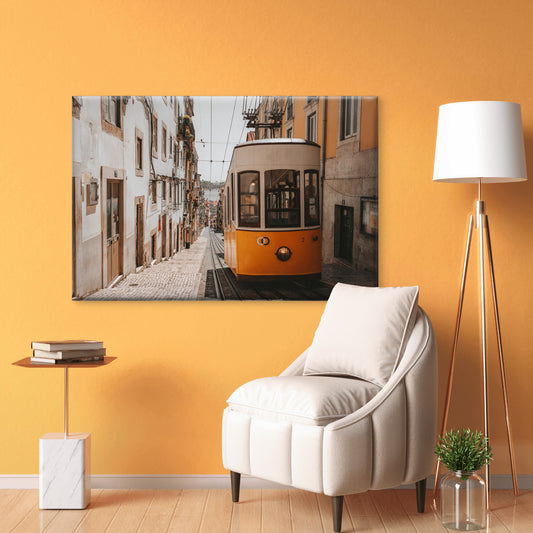Yellow Tram in Cobblestone Street, Lisbon, Portugal Neutral Vintage Wall Art Decor 100% Australian Made