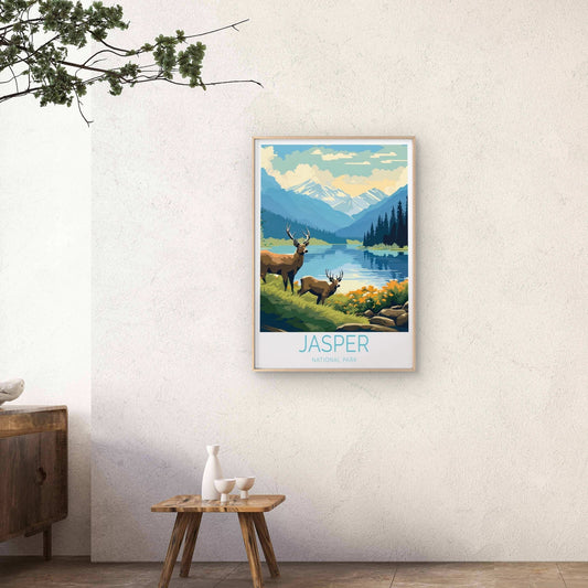 Jasper National Park, Deer & River Art Travel Poster Print Wall Art