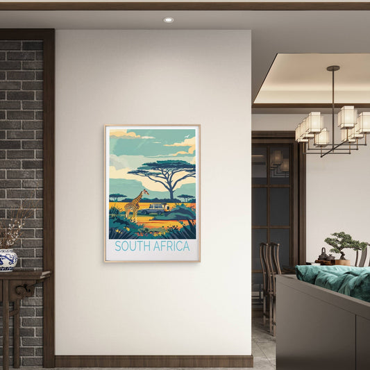 South Africa, Giraffe and Jeep in Jungle Travel Poster Print Wall Art