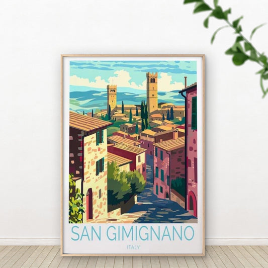San Gimignano Italy, Trees & Houses Art Travel Poster Print Wall Art