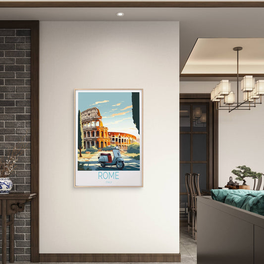 Italy Rome Colosseum, Light Blue Scooter Travel Poster Print Wall Art