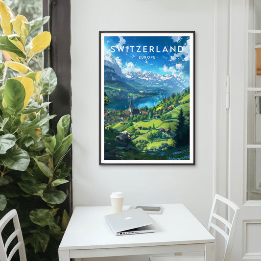 Switzerland Geneva Lake & Swiss Alps Vibrant European Mountain Travel Poster Print Wall Art