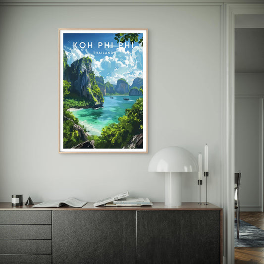 Koh Phi Phi Islands Thailand Tropical Beach Lush Green Cliffs Travel Poster Print Wall Art