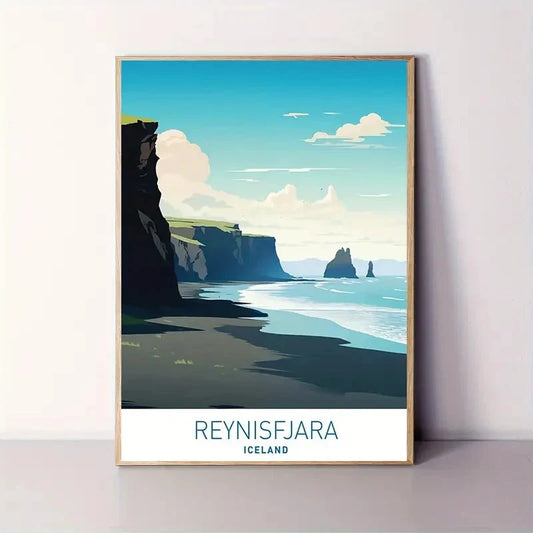 Reynisfjara Iceland Coastal Black Sand Beach Rock Travel Poster Print Wall Art