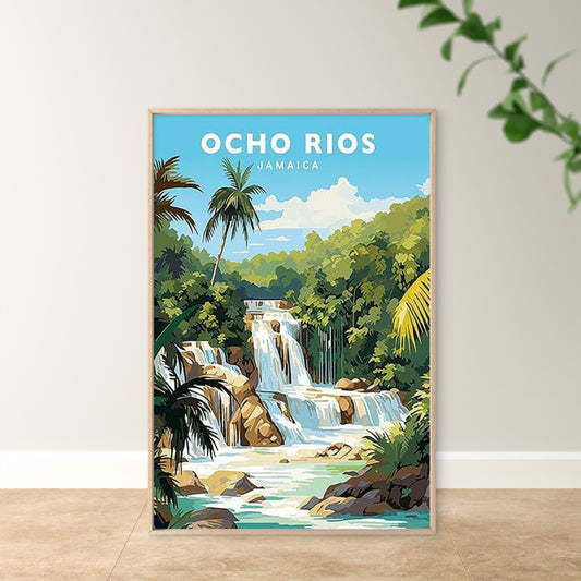 Rios Jamaica Caribbean Waterfall & Palm Tree Travel Poster Print Wall Art