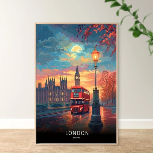 London England Bus & London Skyline Vintage Travel Poster Print Wall Art