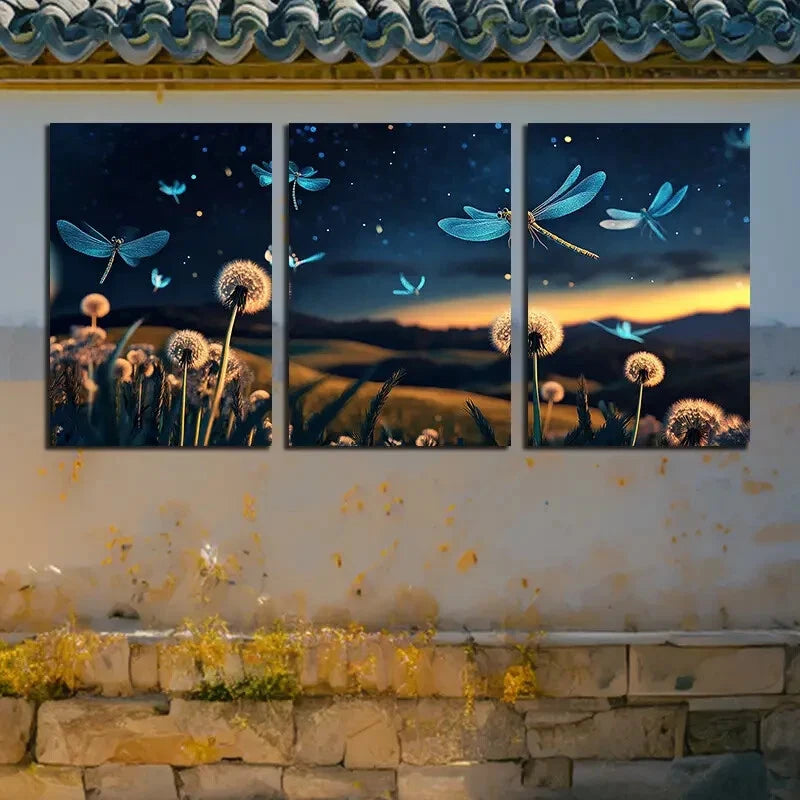 3pcs Dandelion Field with Dragonflies Illustration Metal Print Ready to Hang Art