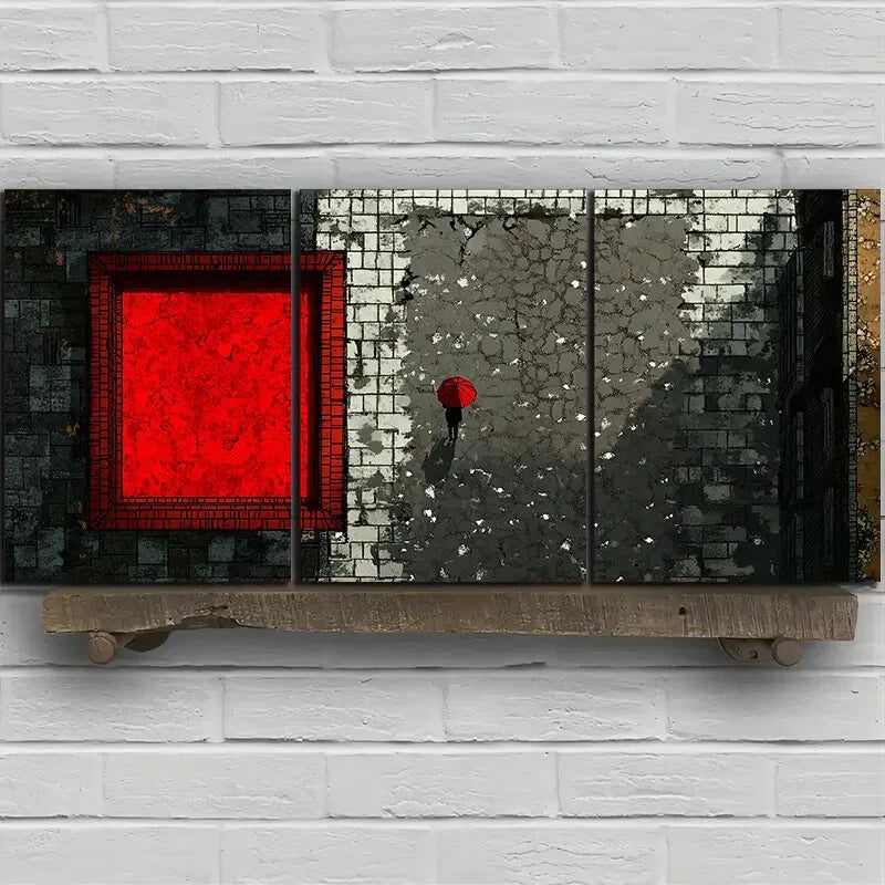 3pcs People Holding Red Umbrellas on Rainy Metal Print Ready to Hang Art