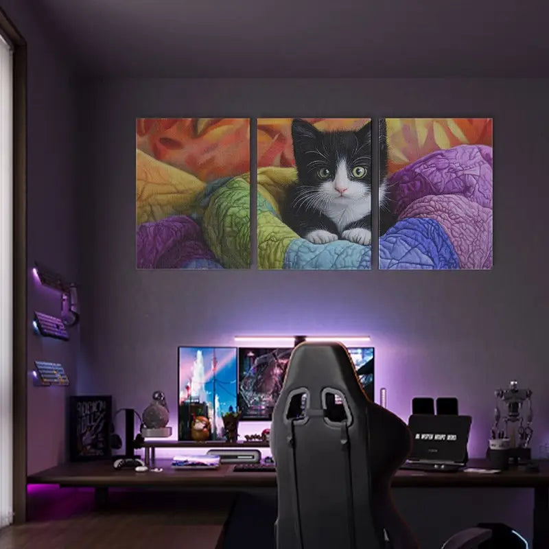 3pcs Vibrant Black and White Kitten with Soft Fur Metal Print Ready to Hang Art