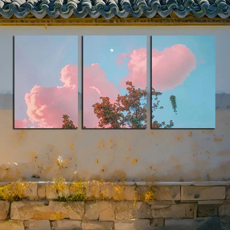3pcs Vibrant Pink Cloudy View with Tree Scene Metal Print Ready to Hang Art