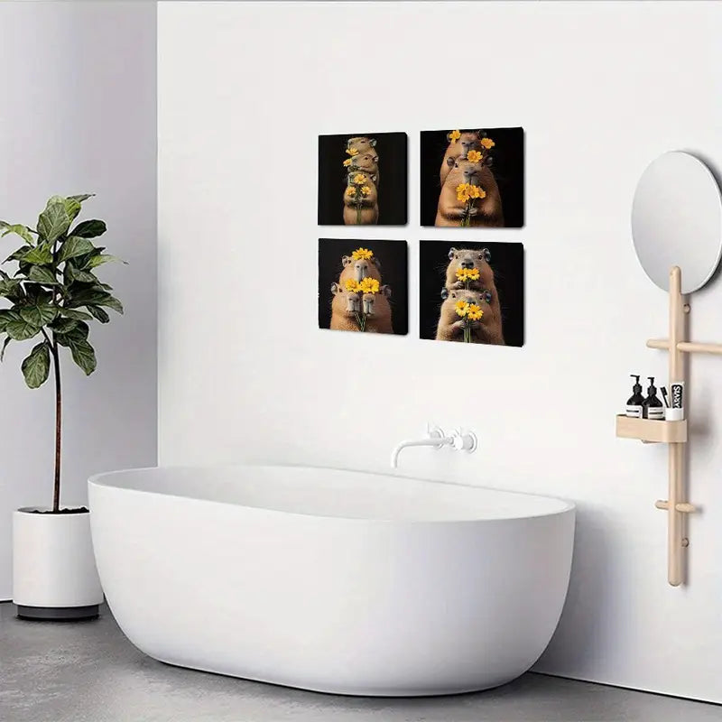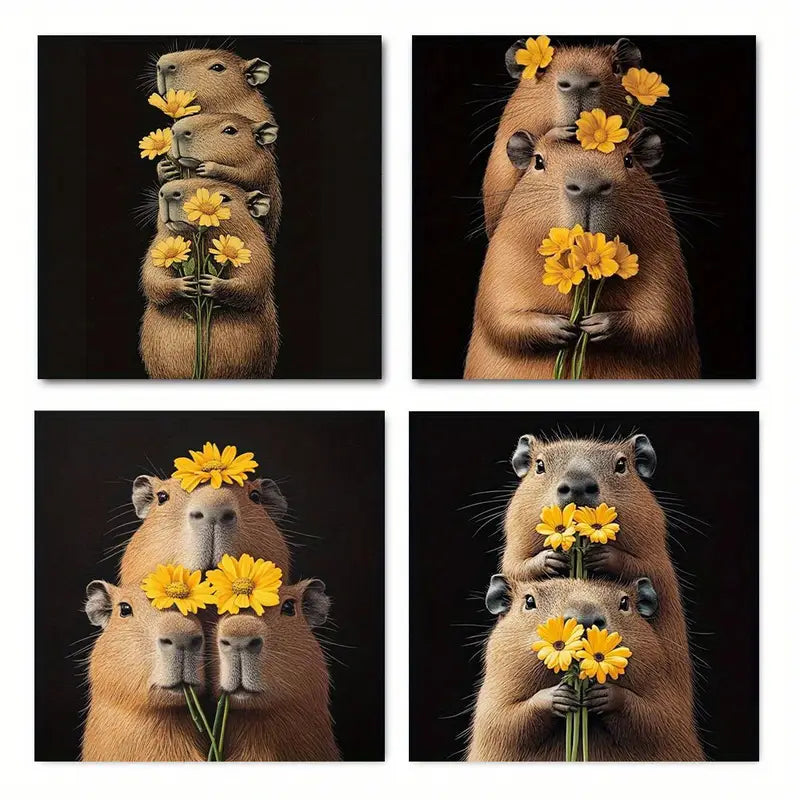 4pcs Capybara and Flowers Vintage Abstract Wall Art Canvas Framed