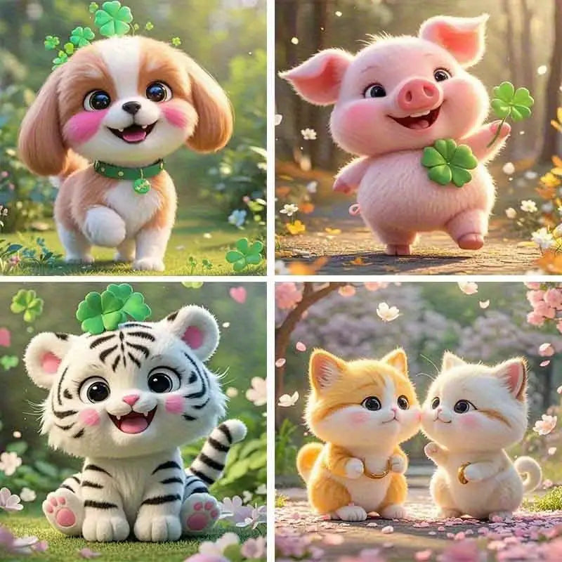 4pcs Cute Little Tiger,Dog,Pig And Kitty Wall Art Canvas Framed