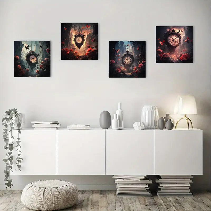4pcs Pink Rose & Butterfly Whimsical Clock Desig Wall Art Canvas Framed