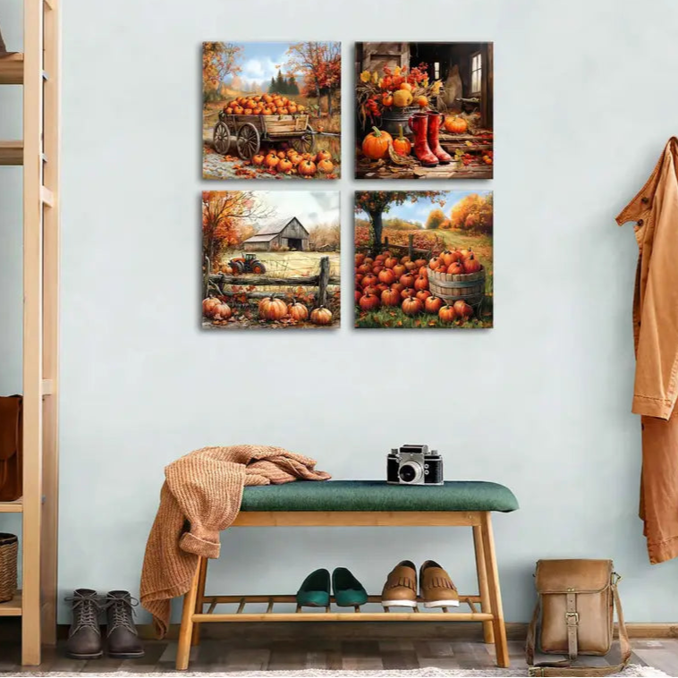 4pcs Pumpkin Field, Old Barn & Truck Wall Art Canvas Framed