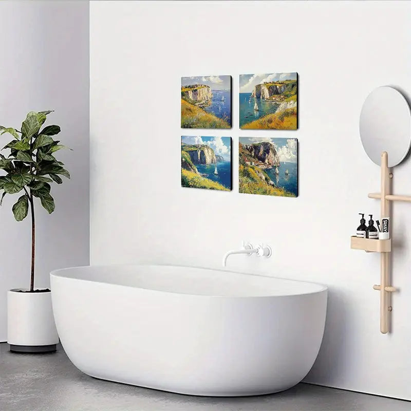 4pcs Village with Cliffside View and Sailboat Wall Art Canvas Framed
