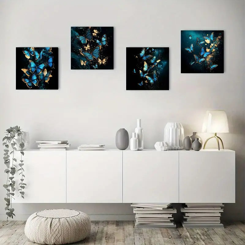 4pcsGolden Blue Butterfly Leaves Posters, Wall Art Canvas Framed