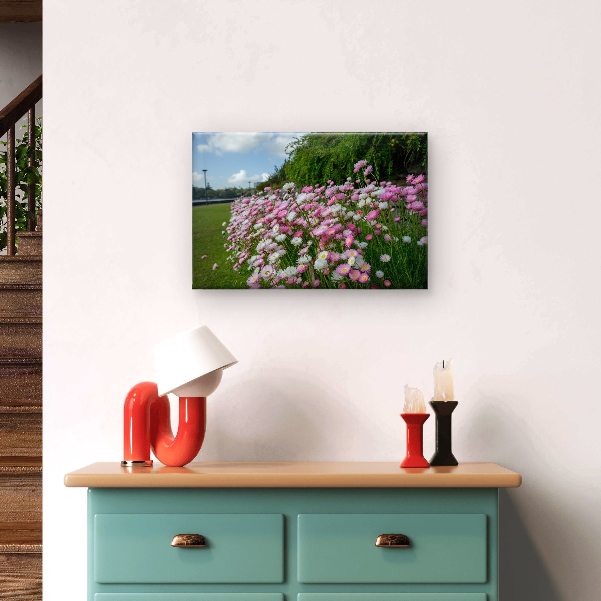 Enjoy a burst of colour with this striking display of Australian everlasting paper daisies in bloom. Perfect for adding joy and botanical elegance to your living space, this wall art decor celebrates the vibrant beauty of native flowers. Proudly Australian made.