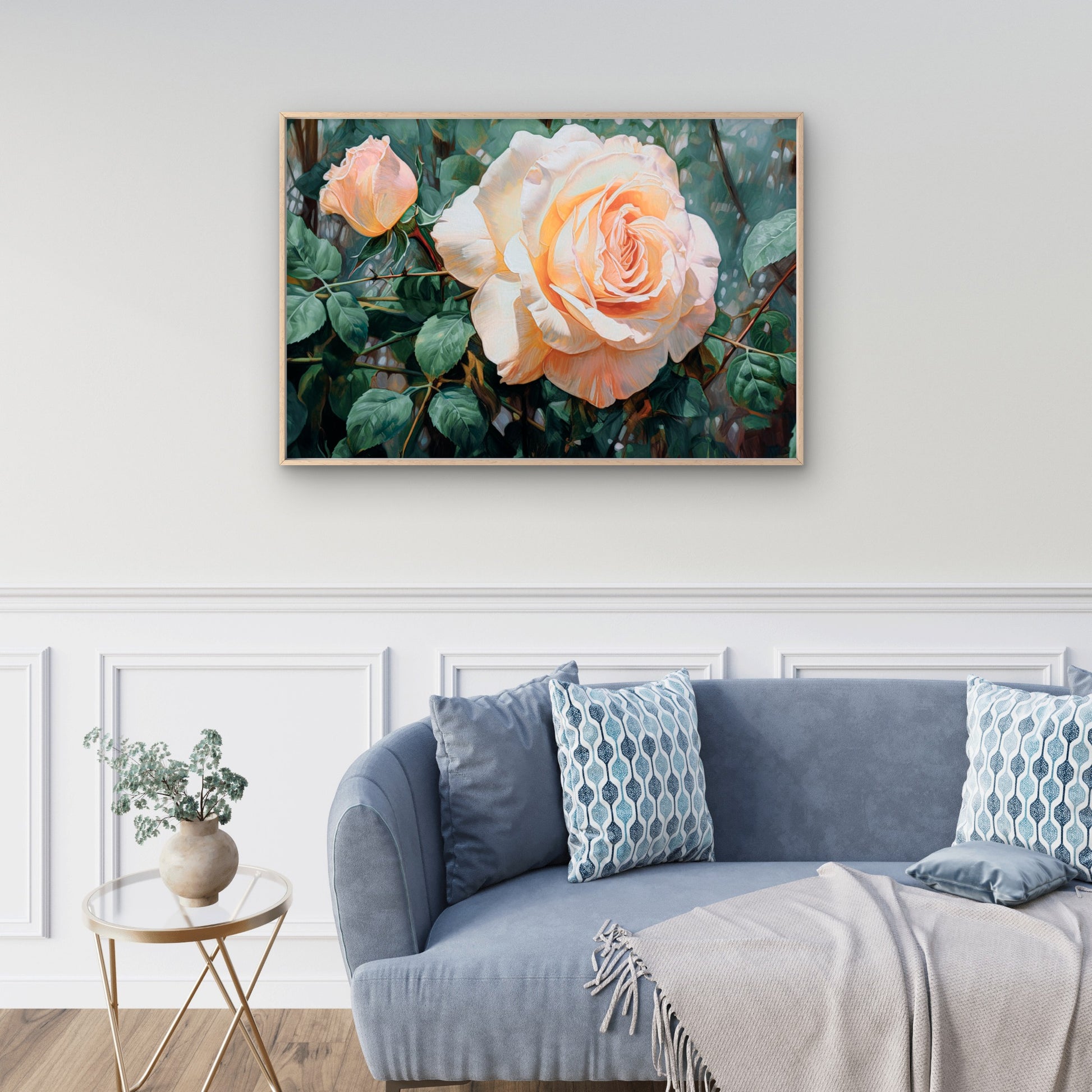 Creamy Apricot-Hued Rose in Full Bloom Oil Painting Wall Art Decor 100% Australian Made