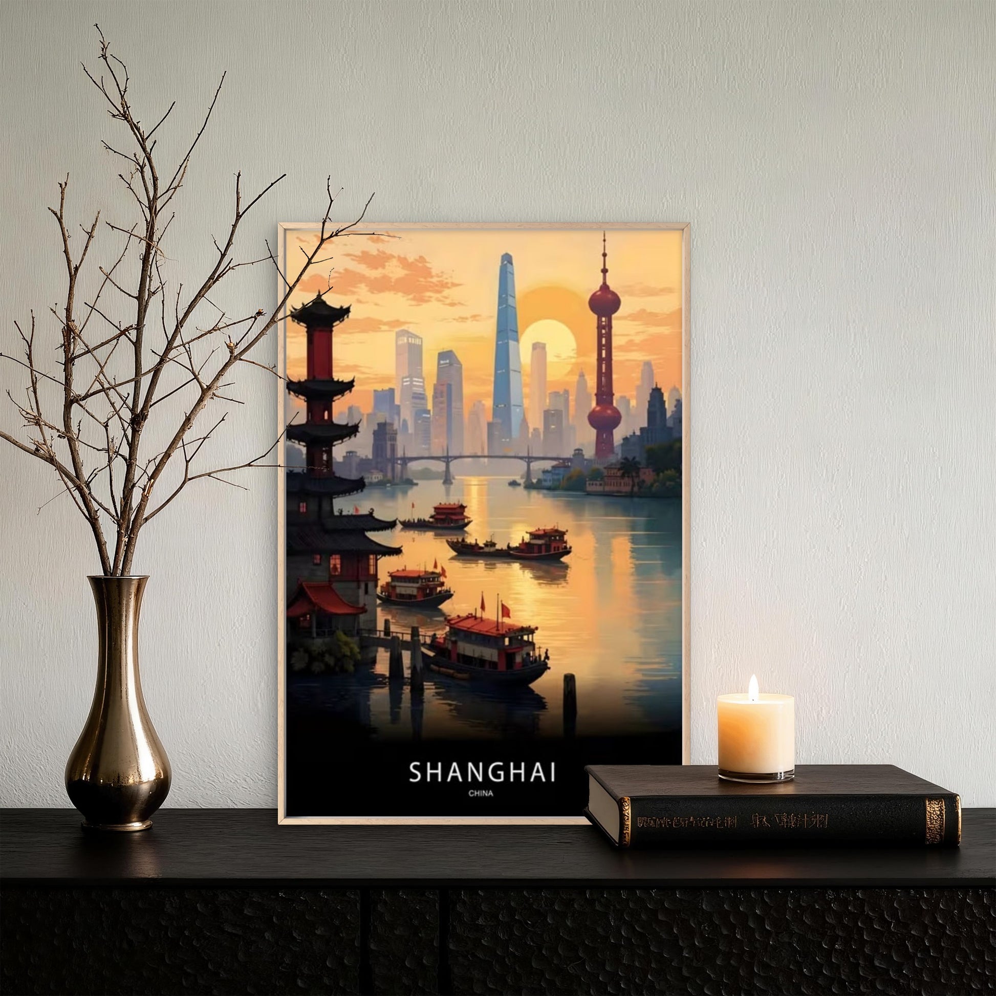 Shanghai China Skyline Ink Painting Travel Poster Print Wall Art