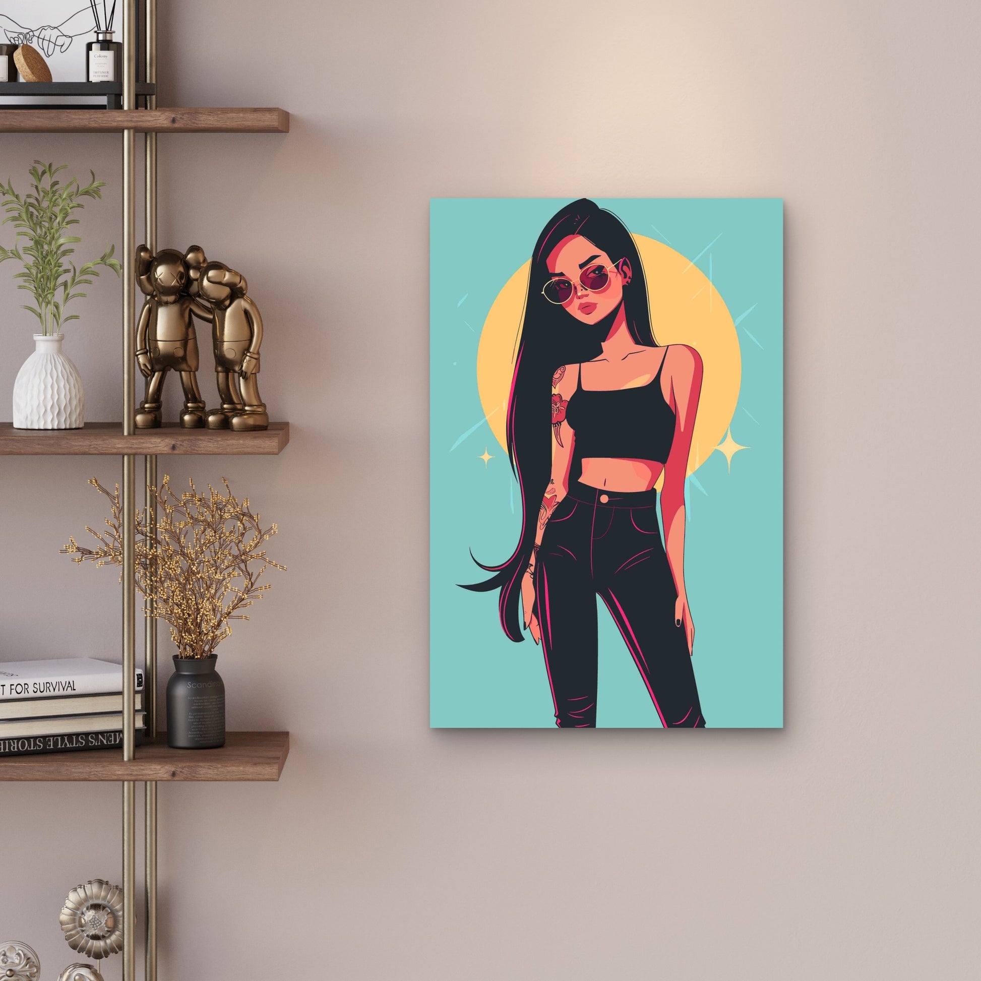 Stylish Pop Art Illustration Of A Girl In Black Cloth Metal Print Ready to Hang