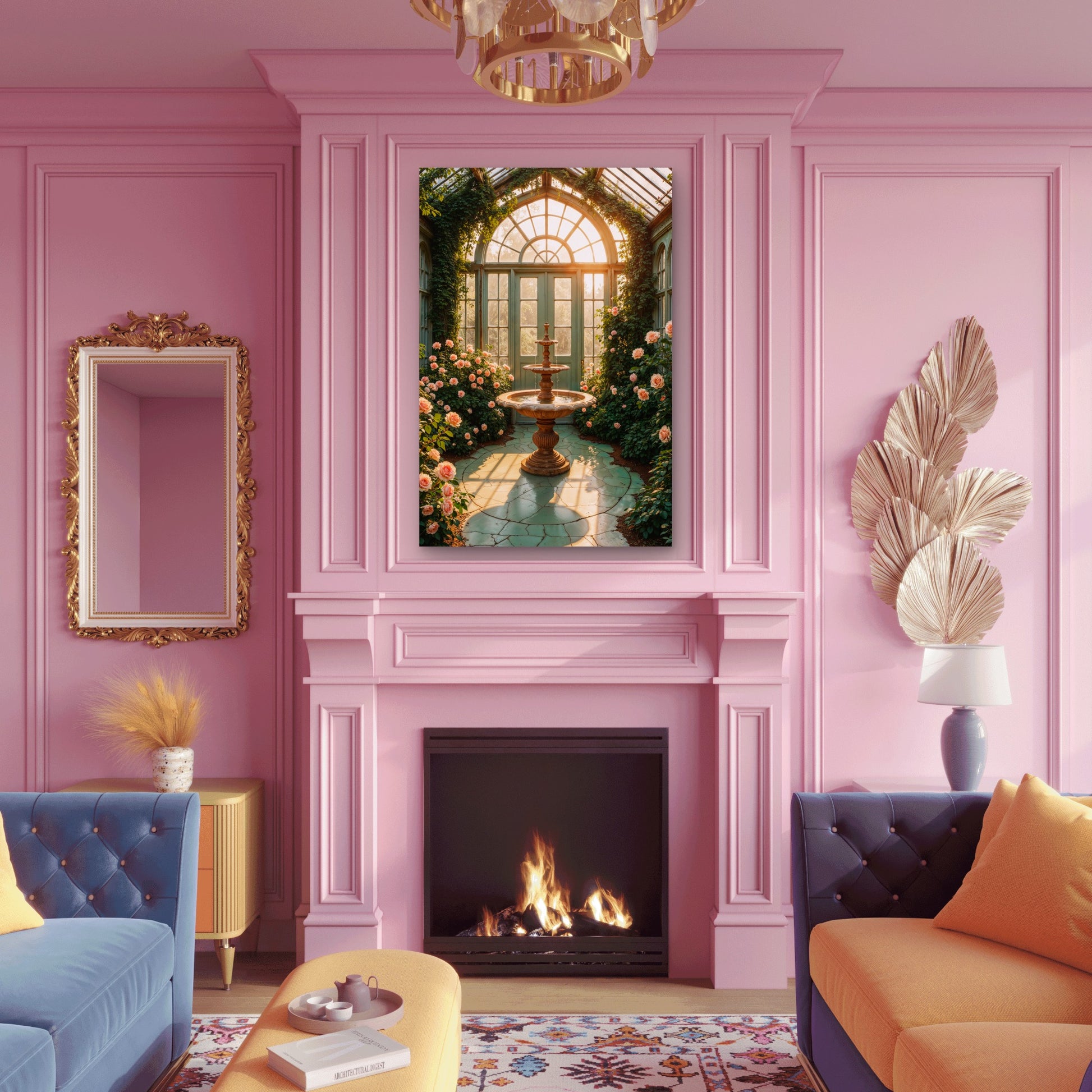 Sunlit Greenhouse Fountain 60x90cm Metal Print Ready to Hang