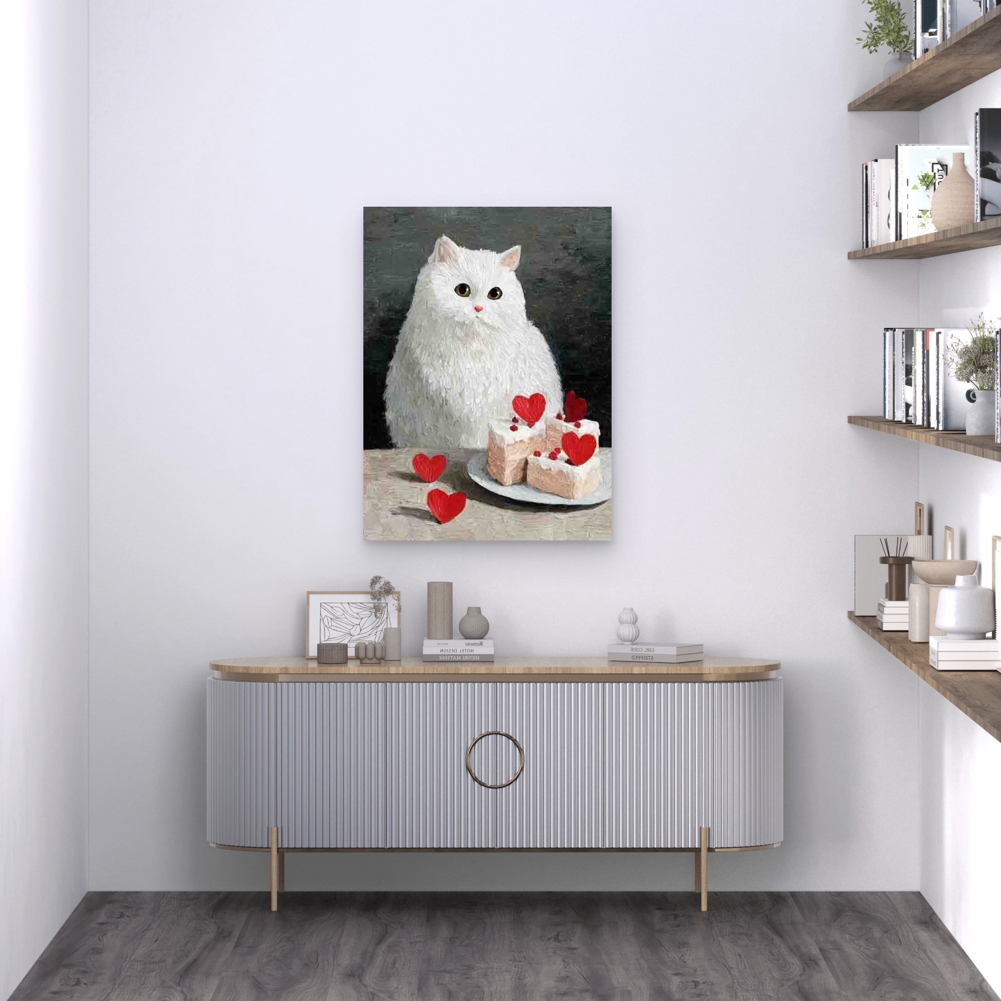 White Cat And Cake And Hearts Metal Print Ready to Hang